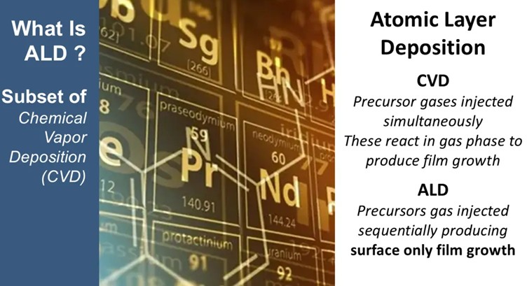 ALD exposes a surface sequentially with pulsed chemical vapours separated by a nitrogen purge. A first precursor forms one monolayer of coating by reacting with the substrate surface (usually with OH groups terminating a surface).